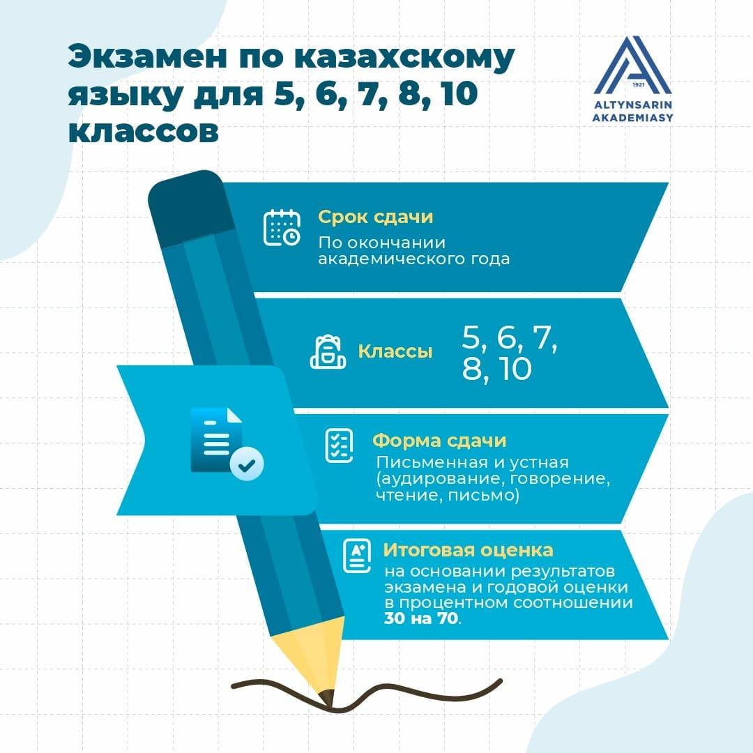 В текущем учебном году обучающиеся 5, 6, 7, 8, 10 классов при завершении академического года сдают экзамен по предмету «Казахский язык» в классах с казахским языком обучения и по предмету «Казахский язык и литература» в классах с русским, уйгурским, узбекским, таджикским языками обучения.