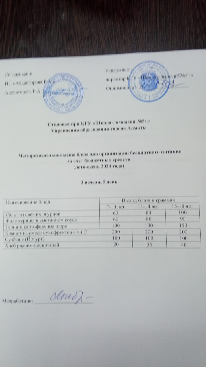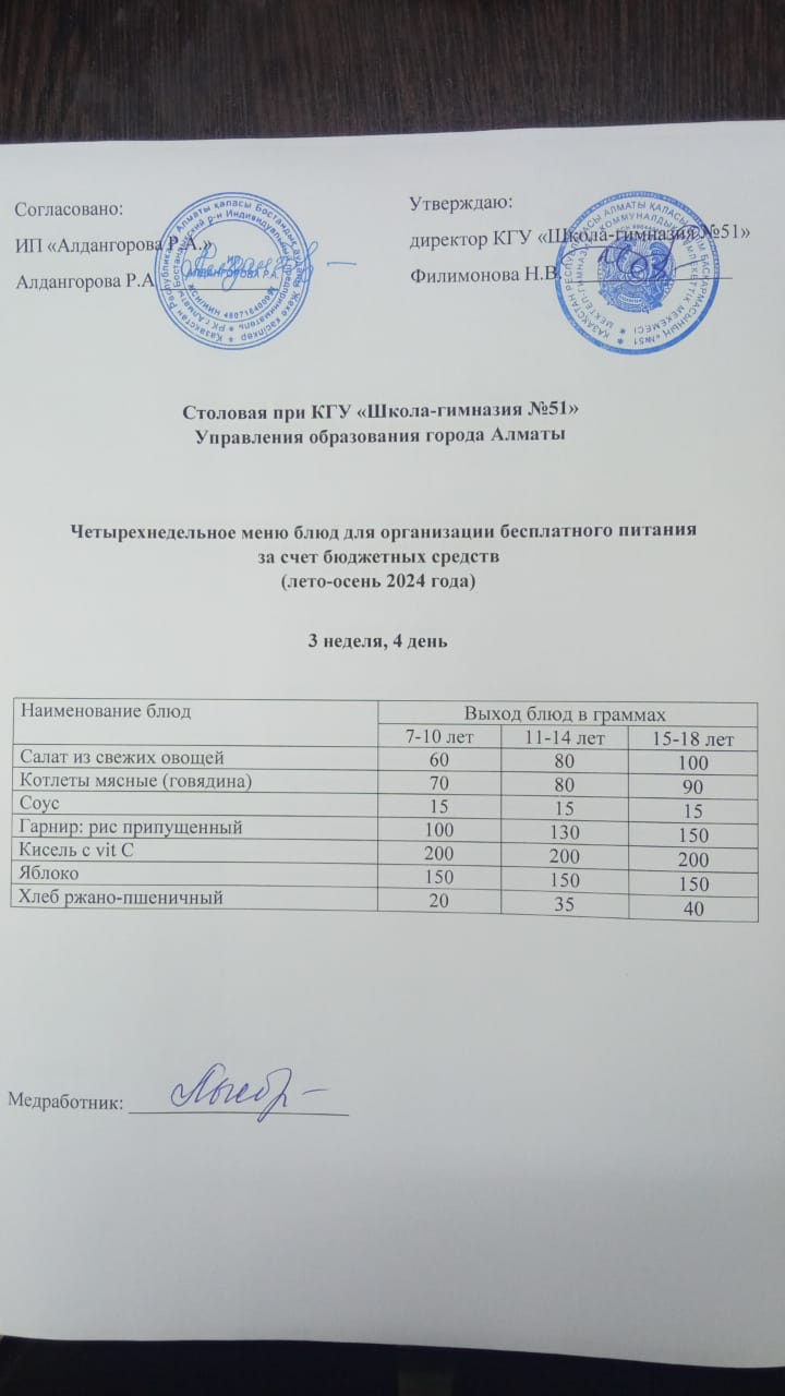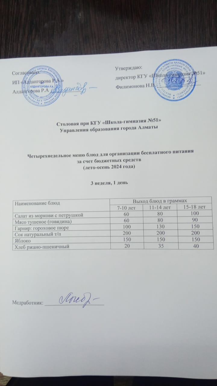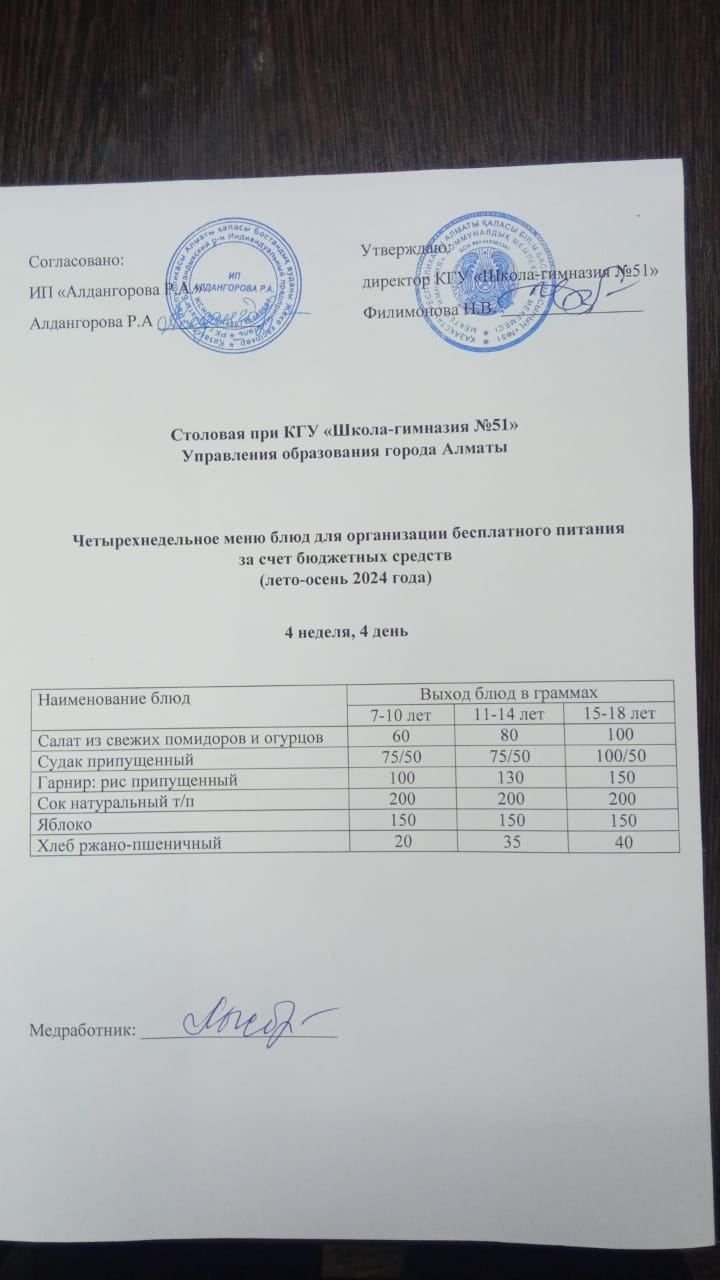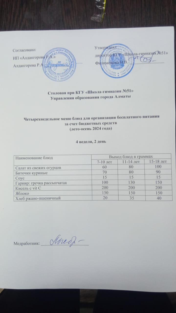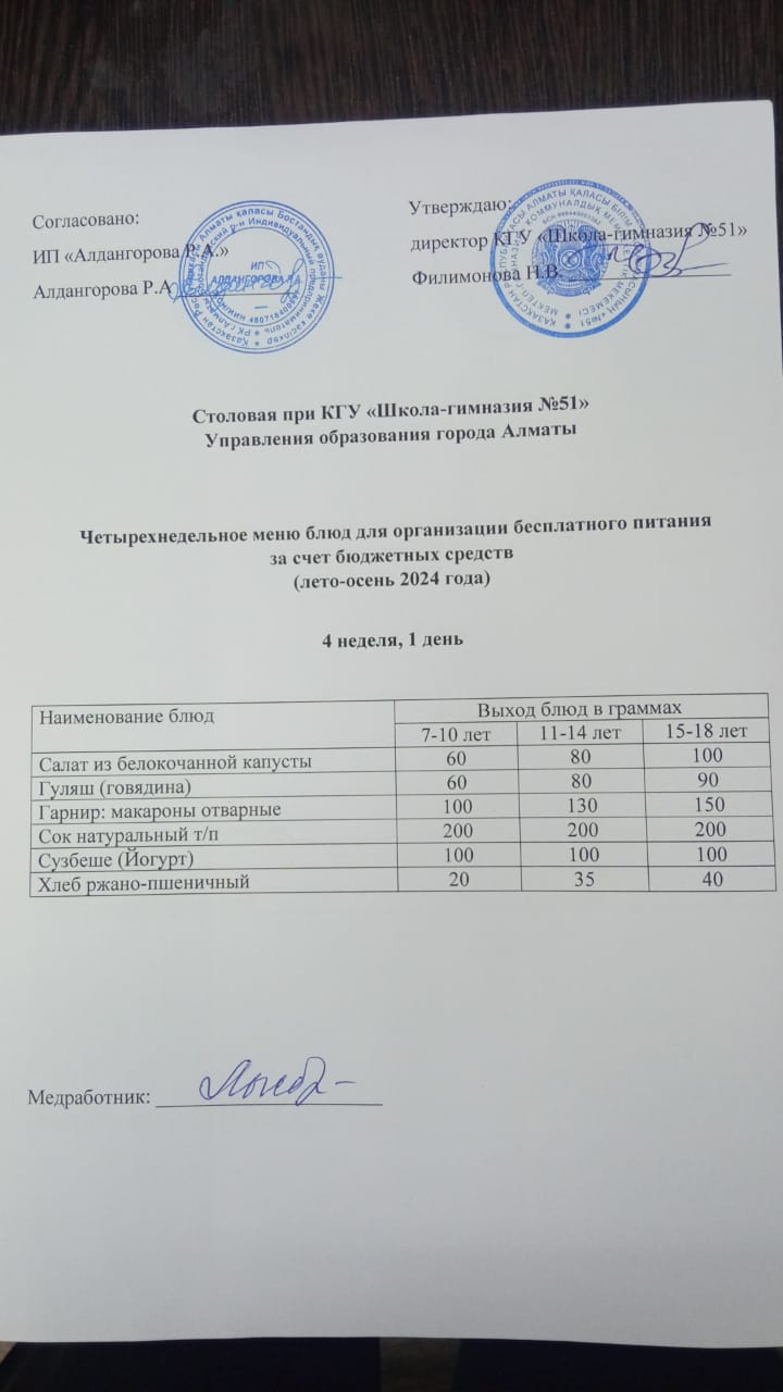 Перспективное 4-х недельное меню блюд горячего питания КГУ "ШГ51"