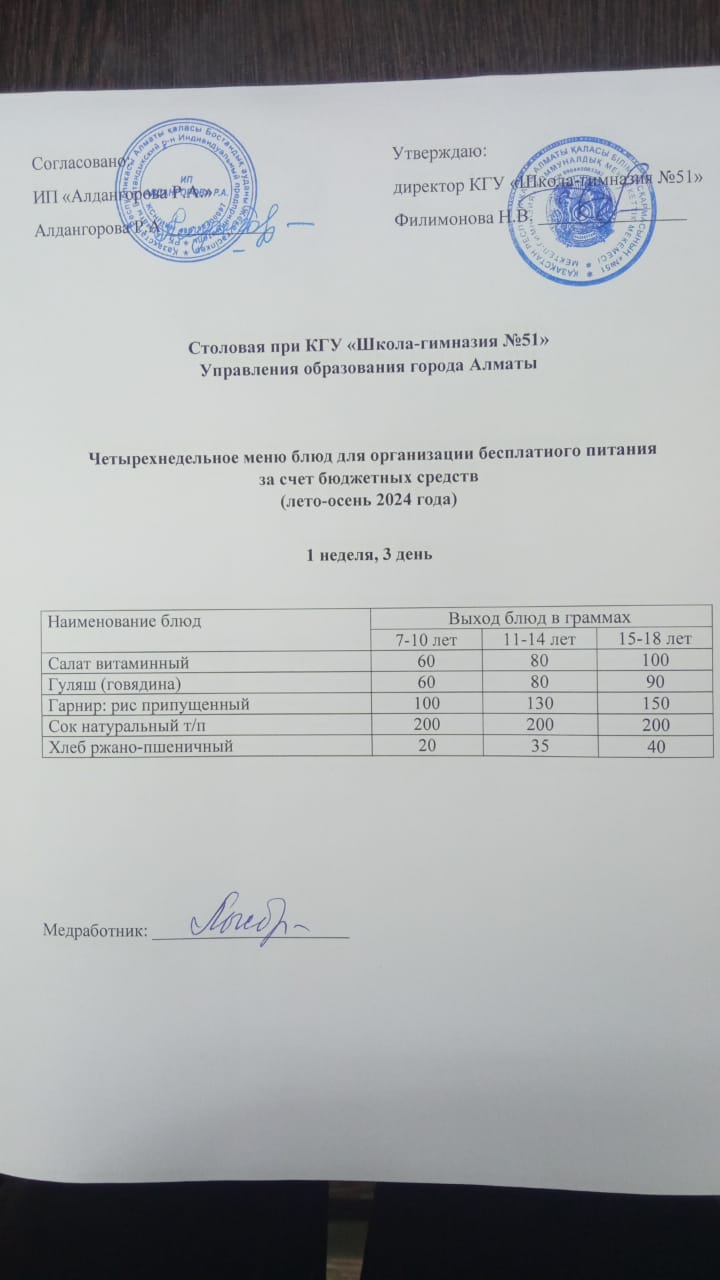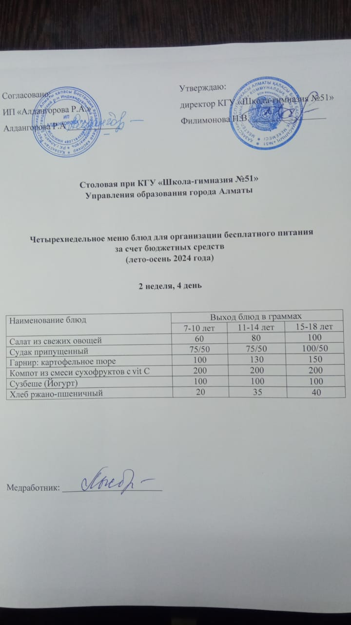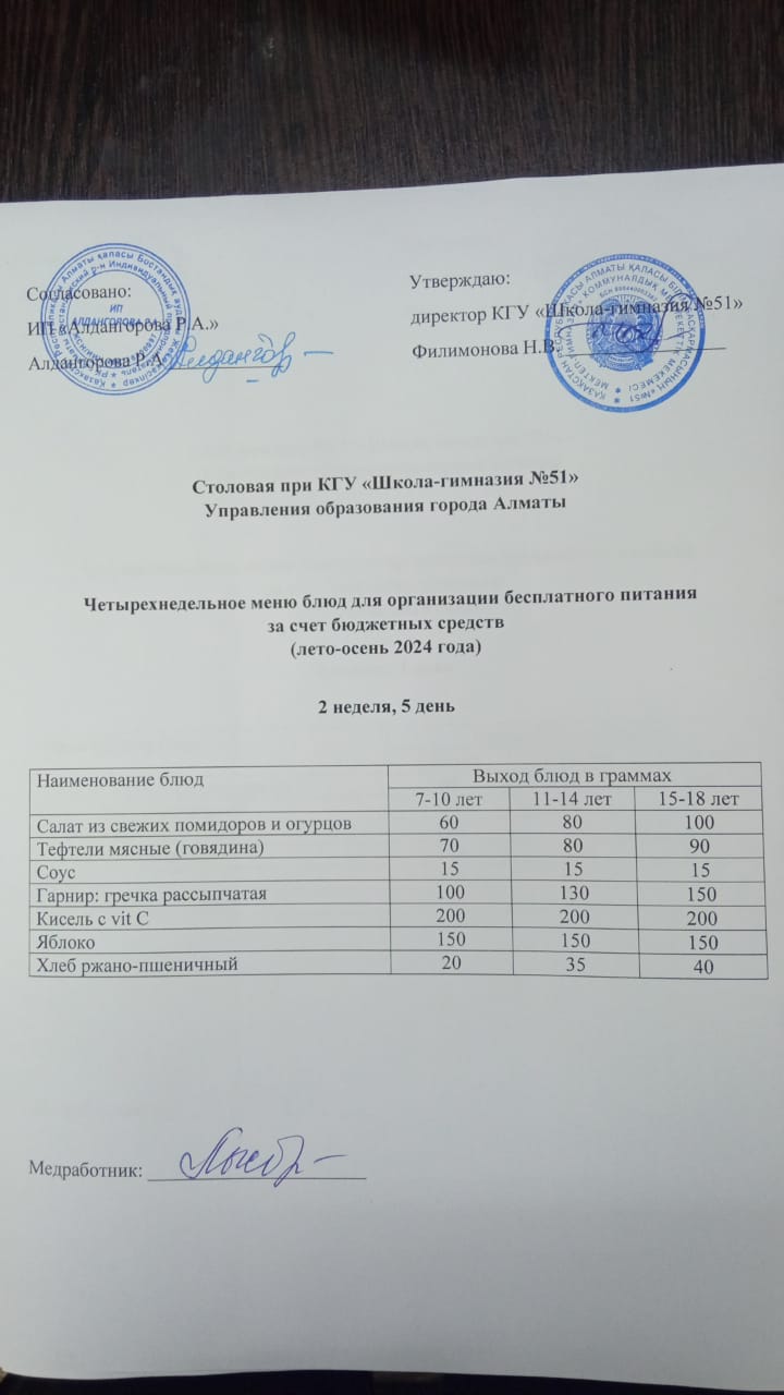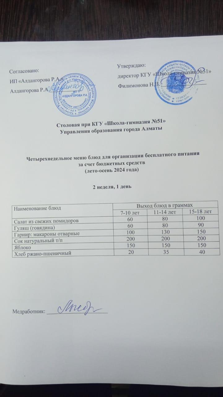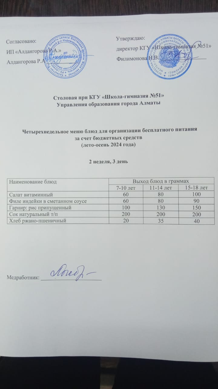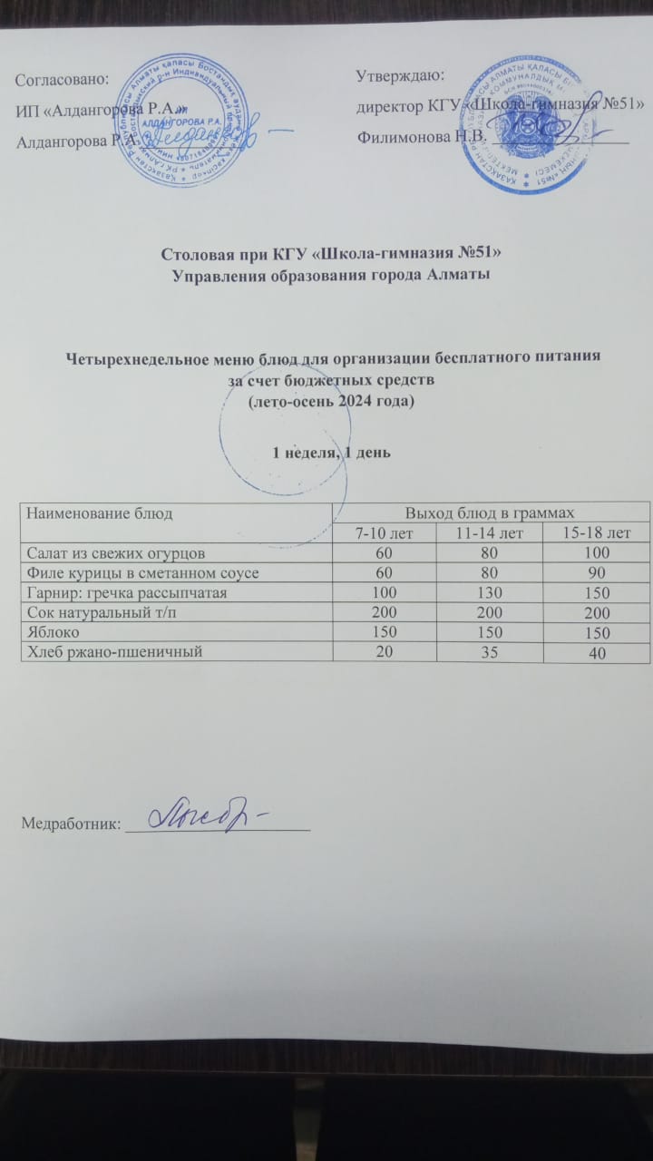 Перспективное 4-х недельное меню блюд горячего питания КГУ "ШГ51"