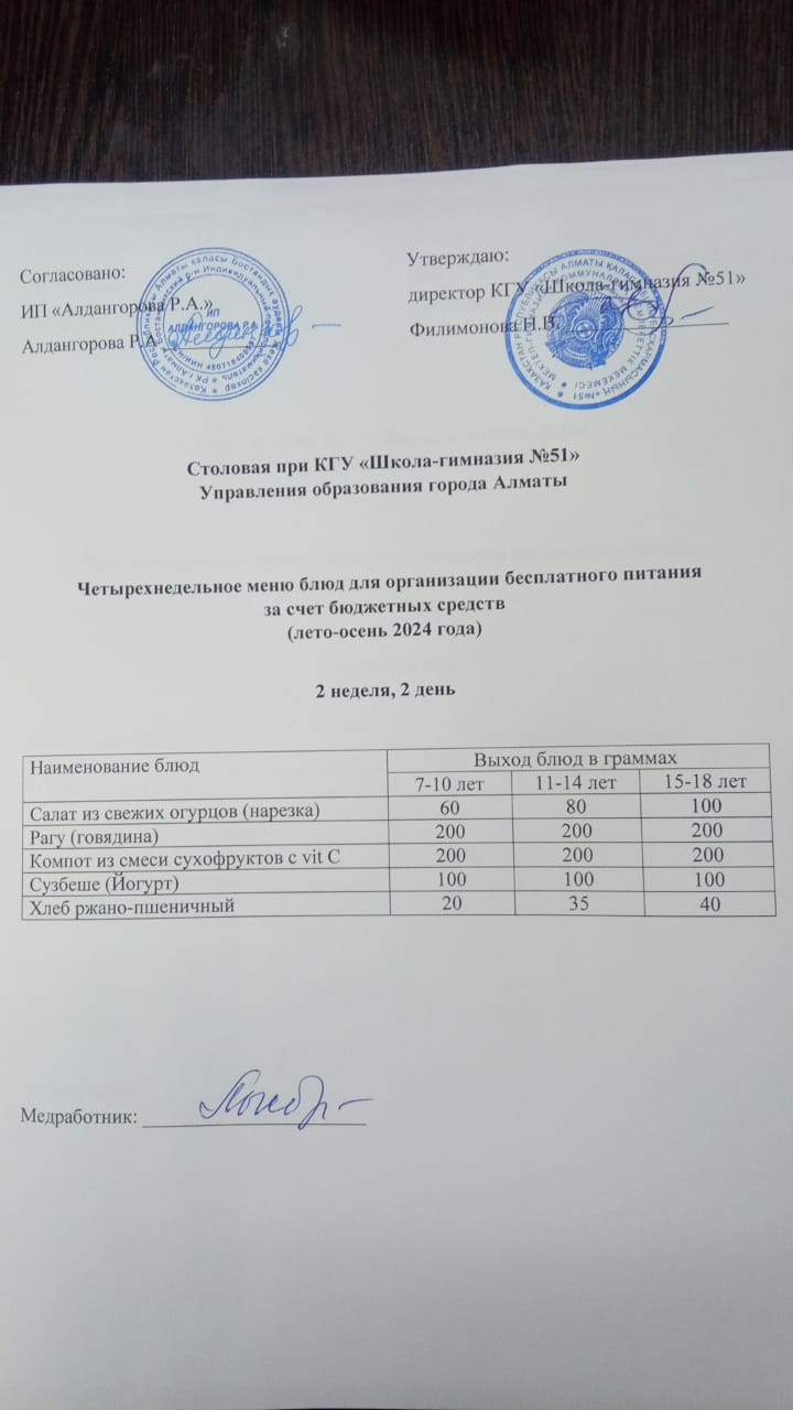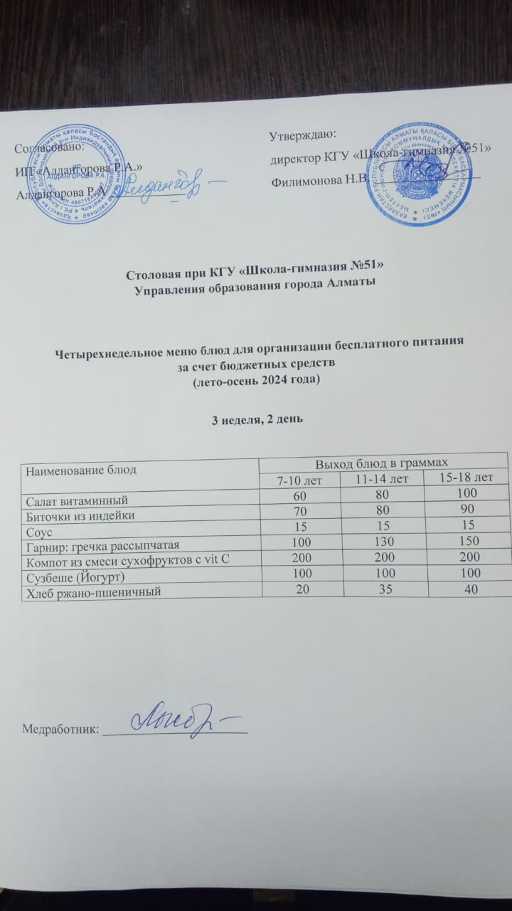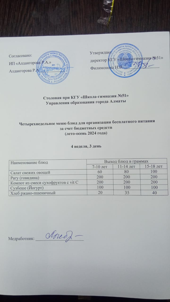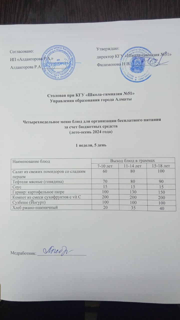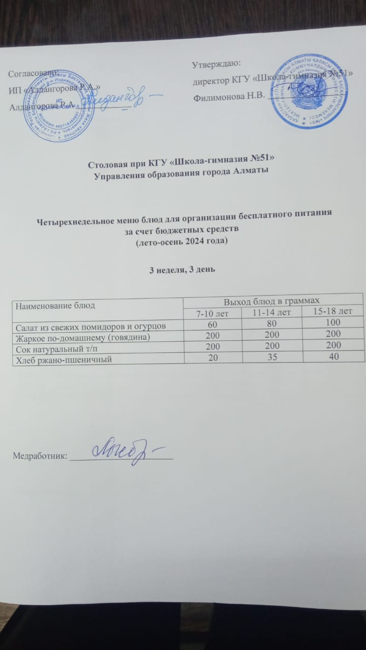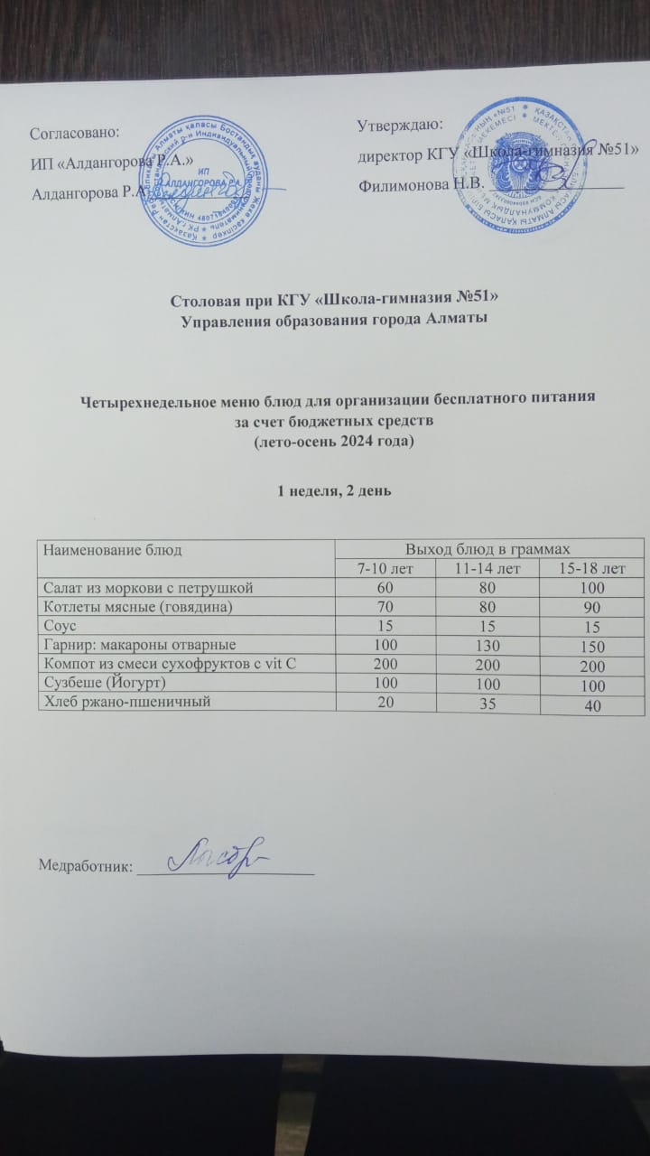 Перспективное 4-х недельное меню блюд горячего питания КГУ "ШГ51"