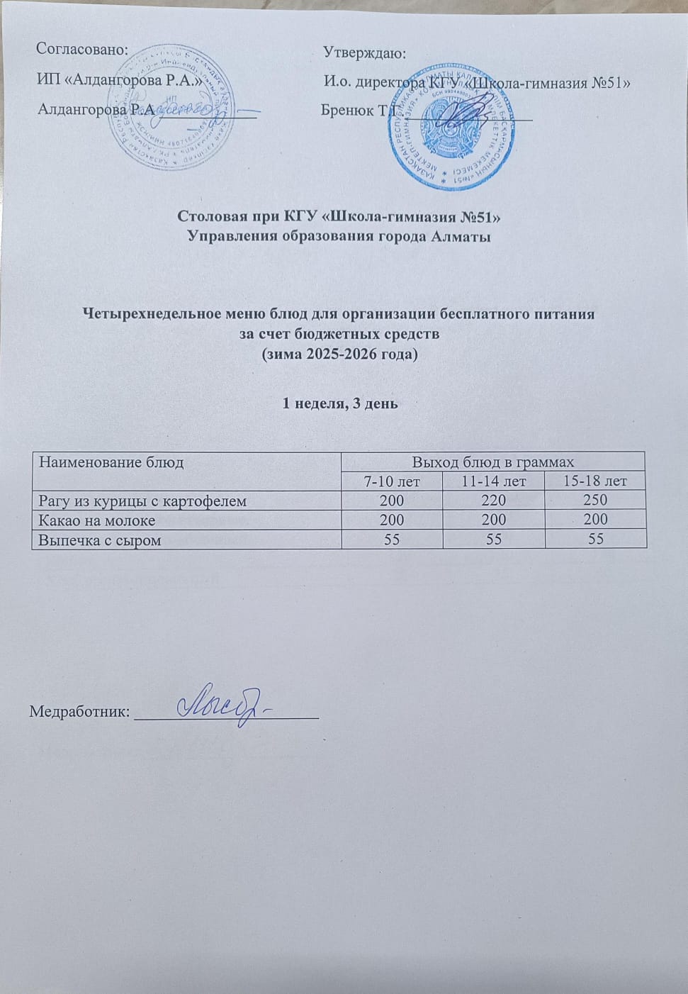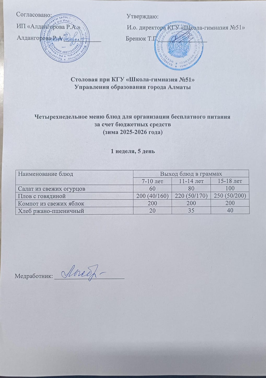 Перспективалық мәзір 1 апта/ Перспективное меню 1 неделя